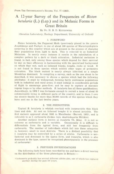 A 12-year survey of the frequencies of Biston betularia (L.)(Lep.) and its melanic forms in Great Britain