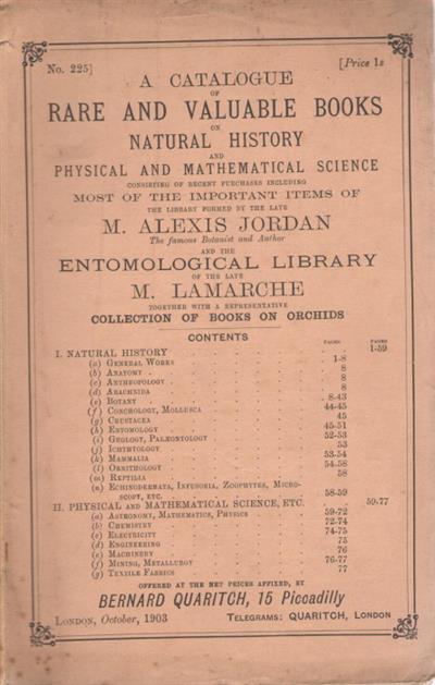 A Catalogue of Rare and Valuable Books on Natural History and Physical and Mathematical Science Consisting of Recent Purchases Including Most of the Important Items of the Library formed by the late M. Alexis Jordan and the Entomological Library of the late M. Lamarche together with a Representative Collections of Books on Orchids