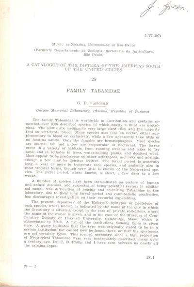 A Catalogue of the Diptera of the Americas south of the United States No. 28: Tabanidae