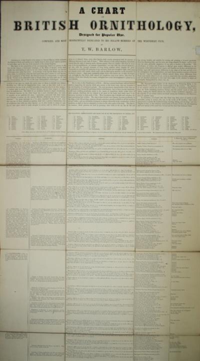 First edition. Rare. Provides a summary of British birds (337 species) with characters of the genera, etc., and number of occurrences of rare visitors. 'The object of the compilation of the accompanying Chart is to present to the tyro in the science, a Systematic Catalogue of the Birds of Britain, which shall enable him with facility to refer to its own Order, Family, and Genus, any Species which may come under his notice.' '...it is hoped that this Chart may often prove of service to the naturalist, young in science, who can, in the words of Dr. Lindley, "find other pleasures in a country life besides hunting, coursing, fishing, and shooting," and who delights to trace, in the infinitely varied works of Creative Power, the all-surpassing skill and wisdom of the mind that devised and the hand that fashioned them.'