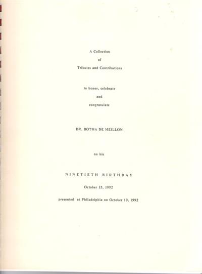A Collection of tributes and contributions to honor, celebrate and congratulate Dr. Botha de Meillon on his ninetieth birthday, October 15, 1992 : presented at Philadelphia on October 10, 1992