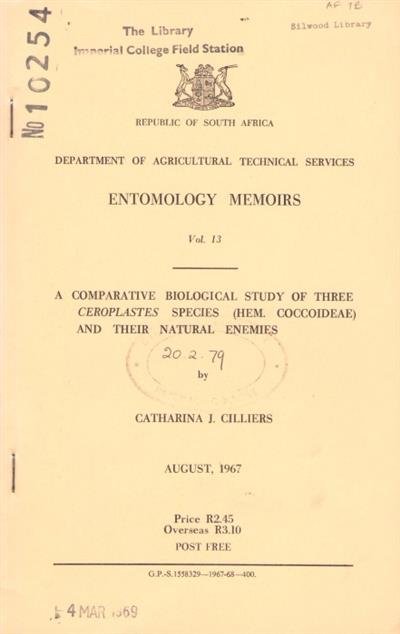 Entomology Memoirs. Department of Agricultural Technical Services, vol. 13.