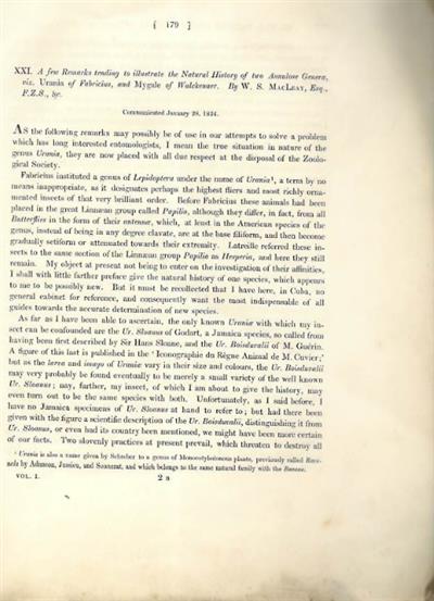 Transactions of the Zoological Society. Vol.1. William Sharp Macleay (1792 - 1865) was a British civil servant and entomologist. He was a prominent promoter of the Quinarian system of classification. In this paper he discusses 'the true situation in nature of the genus Urania'.