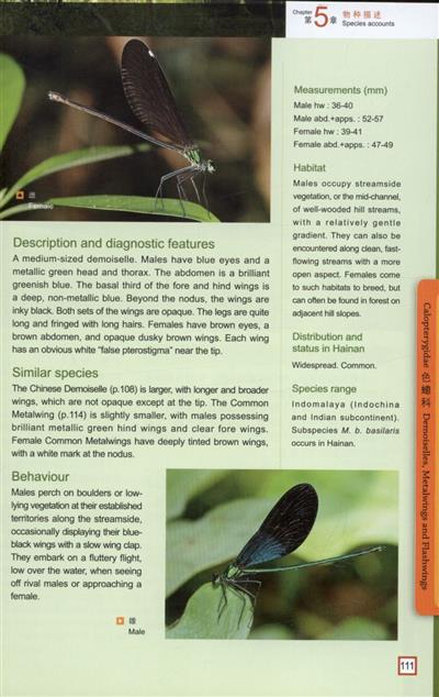 Text Chinese/English. Located in the tropics, the island of Hainan, the southernmost provice of the People's Republic of China, has numerous rivers streams, lakes and swamps. The diverse freshwater habitats support more than 165 species of dragonflies. Among them, 22 are endemic to the island. This book displays the species commonly found on the island.