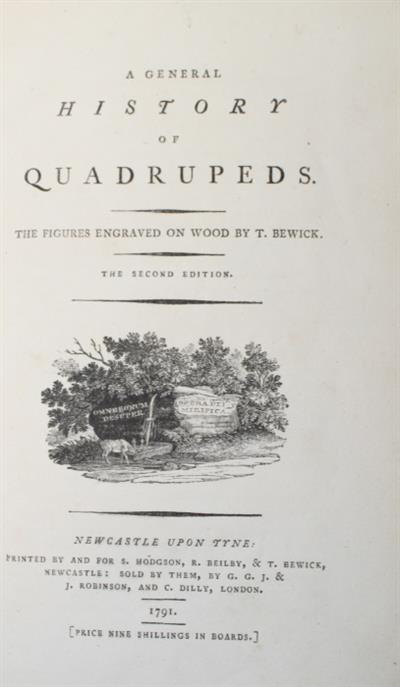 Second edition (considered the best), published only fourteen and a half months after the first (in May 1790). Roscoe describes the second edition as '... No mere reprint ... A largely revised, expanded, and improved work. Impressions of the cuts are far more satisfactory, there are drastic revisions and many additions in the text, many blocks have been reworked, twelve new figures are added, and the fourteen descriptions of bats make their first appearance.'