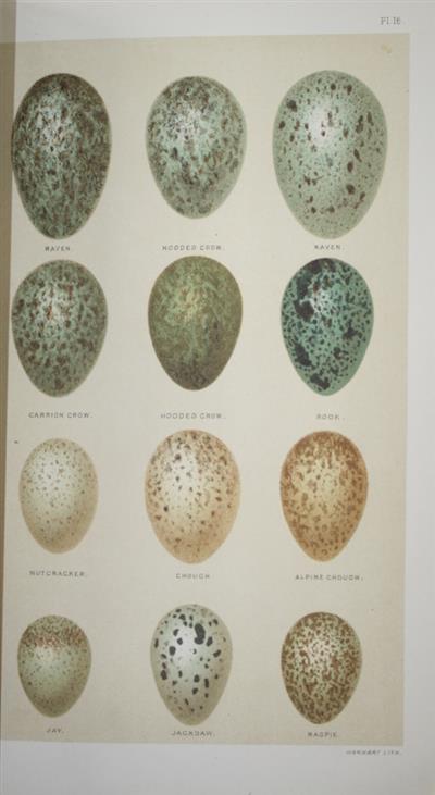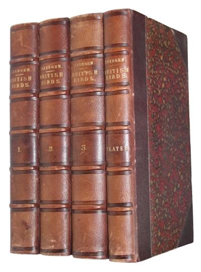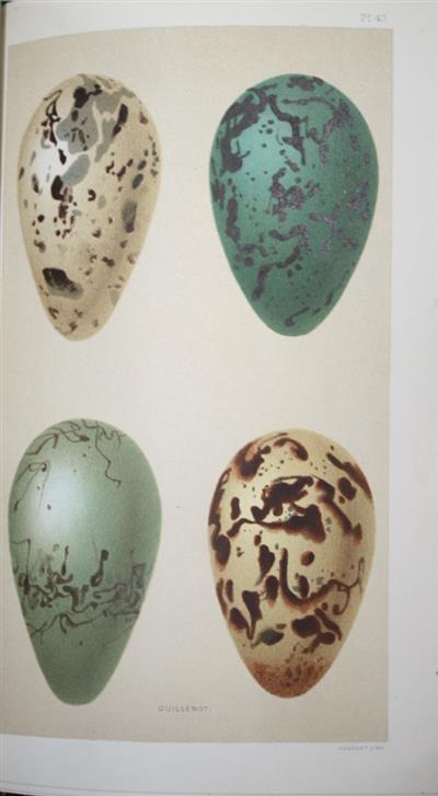 First edition. Fine colour plates of eggs lithographed by Hanhart. Henry Seebohm (1832-1895) was a British steel manufacturer, amateur ornithologist and oologist. He travelled widely in Europe in search of rare birds and eggs. He wrote a number of books, and numerous scientific papers. According to Mullens & Swann (1917), '... his reputation as an ornithologist rests largely upon his History of British Birds, a thoroughly original work, being compiled for the most part from the author's personal observations in the field instead of from the writings of others ...'
