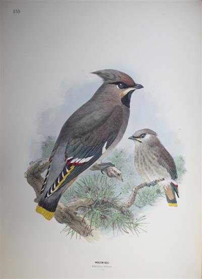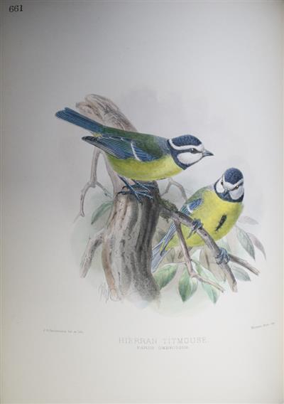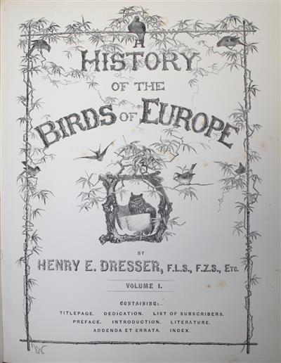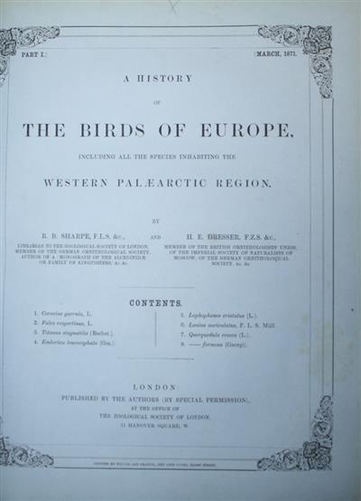 First edition. Scarce. A monumental work on the avifauna of Europe, including a total of 736 species, with Dresser attempting to cover all identified species across Europe, from the Azores, the Canary Islands and Madeira, North Africa, to the Urals, Caucasus, Turkey, Syria, part of Persia and across to the Red Sea. Fine hand-coloured lithographic plates of birds (heightened in gum arabic) by J.G. Keulemans, Joseph Wolf, E. Neale and A. Thorburn, printed by M. & N. Hanhart, Walter and the Mintern Brothers. Also includes the two volumes on eggs with colour plates printed by Andre & Sleigh Ltd., produced using the three-colour process, to illustrate the subtleties of bird egg markings. Henry Eeles Dresser (1838-1915) was an English businessman and ornithologist. He joined the British Ornithologists' Union in 1865, and served as Secretary between 1882 and 1888. The Birds of Europe was originally published in 84 parts between 1871 and 1882 (Vol. I-VIII), and a Supplement (Vol. IX), originally published in 9 parts appeared in 1895-1896. The text was begun by Dresser in conjunction with Dr. R. Bowdler Sharpe, however the latter's involvement ended with the 12th part, when he took up an appointment at the British Museum. Eggs of the Birds of Europe was originally published in 24 parts between 1905 and 1912.