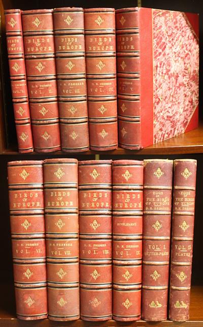 11 vols, large 4to (324x250mm): Birds, 9 vols, cont. red half morocco, raised bands to spines, gilt and black rules between compartments, beaded gilt rule to bands, gilt motifs to compartments, marbled boards and endpapers, top edges gilt, additional wood-engraved title pages; Eggs, 2 vols, cont. red half morocco by Geo. & A. Grant, spines closely matching the main set, with the same gilt motifs to spine compartments, but with red cloth boards. Birds: some minor rubbing/scuffing to corners; small chips to three head caps; Eggs: heavier scuffing to leather on joints and corners. Orig. printed blue wrappers to The Birds of Europe Vol. I-VIII (parts I-LXXXIV) bound at the end of Vol. I, together with various prospectuses, temporary title pages and lists of subscribers; part wrappers for Eggs of the Birds of Europe (parts I-XXIV) bound at the rear of Vol. II. Occasional isolated light spotting, but a very clean attractive set.