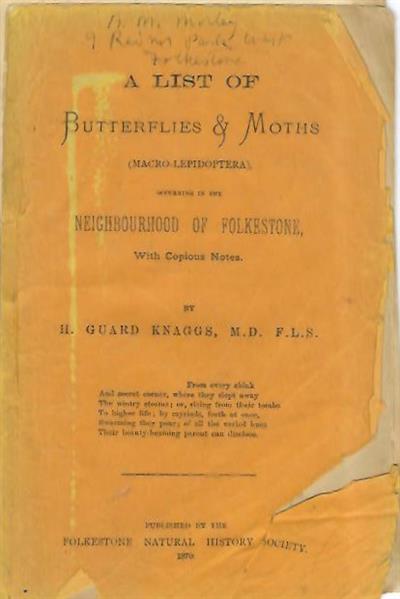 8vo, separate issue: orig. wrappers, worn/torn, lacking rear wrapper, stitching broken; original version published in the Quarterly Journal of the Folkestone Natural History Society (1869, part 4) is stapled in plain blue wrappers, worn. Both with marginal markings and annotations. Previous owners' names: Arther M. Morley, author of List of Butterflies and Moths occurring in the neighbourhood of Folkestone (1931); Michael Dickens, once owner of the Butterfly Farm in Bilsington, near Ashford, Kent.