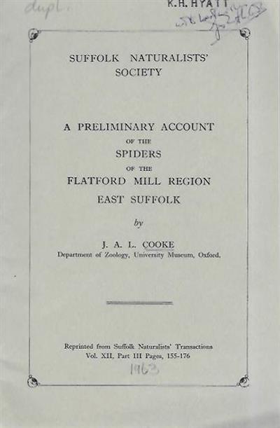 A Preliminary Account of the Spiders of the Flatford Mill Region, East Suffolk