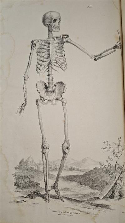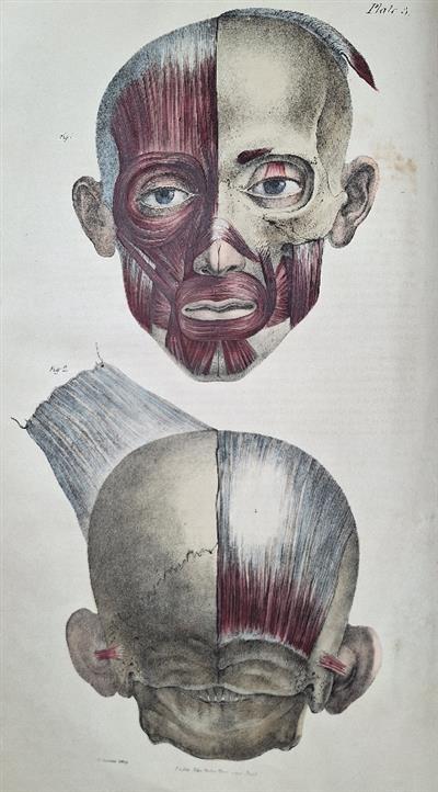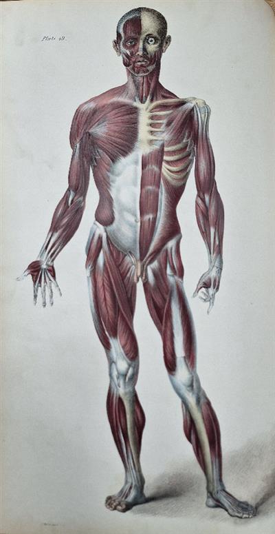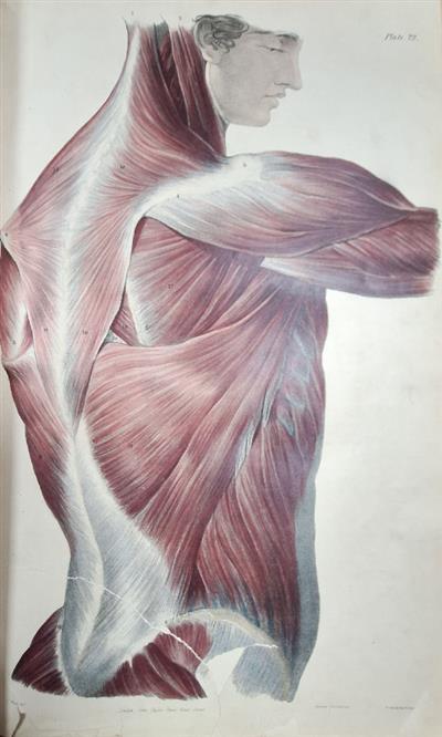2 vols, royal folio (510x325mm), half leather, worn, stained and defective, boards detatched, lacking spines. Frontis heavily stained and torn. Some soiling and spotting throughout, text and plates stained in places, sometimes heavily (approx. 10 plates). A few plates torn mostly without significant loss; some plates (approx. 8) in Muscles more extensively torn, a couple torn right across the plate, several with some loss. One plate is a replacement loosely inserted (margins frayed), from another copy [Viscera, plate 30]; one plate lacking [Muscles, plate 29]. Although this set has obviously been heavily used, and sustained some damage, many of the plates are still largely clean and most are finely hand-coloured (the 26 uncoloured plates were probably never issued coloured).