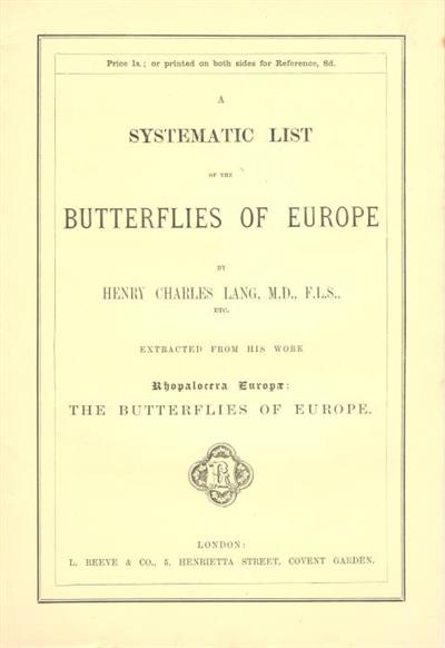 'Extracted from his work Rhopalocera Europae: The Butterflies of Europe'. Price 1s.; or printed on both sides for Reference, 8d. Printed wrappers include adverts. Final two leaves comprise title page to the main work and list of Works on Entomology available from L. Reeve