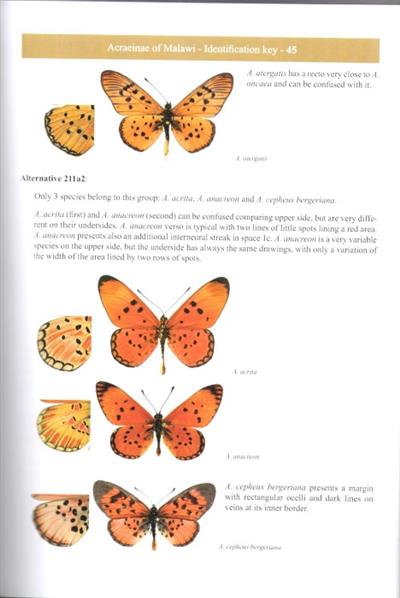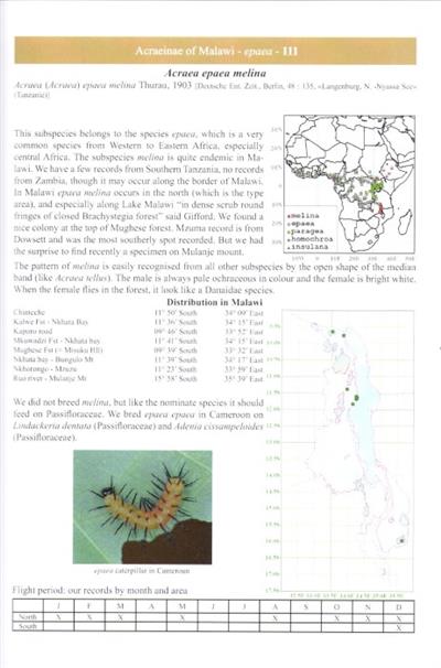 An updated synthesis on the 49 species of Acraea (19 Actinote and 30 Acraea) from this southeast African country. Includes many colour photos of adults (set specimens and living butterflies), some immature stages and foodplants, and habitats. Maps show African and Malawian distributions.