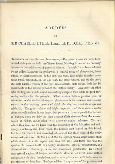 Charles Lyell's address as newly-elected President of the British Association for the Advancement of Science, at its meeting in Bath, 14 Sep. 1864 on the subject of the Mineral Waters of Bath and other Hot Springs.