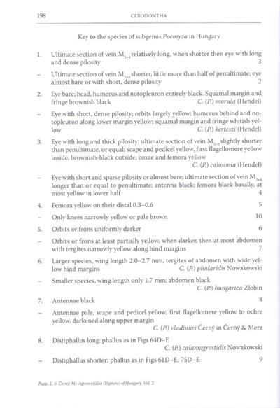 The second volume contains a short Introduction and a chapter of Material and Methods (with reference to the information in Vol. 1) and the first systematic part of the subfamily Phytomyzinae with the genera Selachops Wahlberg (1 sp.), Nemorimyza Frey (1 sp.), Phytobia Lioy (9 spp.), Cerodontha Panzer with the subgenera Cerodontha s. str. (10 spp.), Butomomyza Nowakowski (11 spp.), Dizygomyza Hendel (19 spp.), Icteromyza Hendel (6 spp.), Phytagromyza Hendel (1 sp.), Poemyza Hendel (27 spp.) and Xenophytomyza Frey (4 spp.), as well as Amauromyza Hendel (17 spp.) and Aulagromyza Enderlein (21 spp.) – a total of 127 spp., including 30 species, which are expected to occur. The references in this volume involve works cited in this volume only (for a more complete bibliography see Vol. 1). A catalogue with occurrence data in Hungary, in the Czech Republic and in Slovakia is also given. The text is closed by a taxonomic index of the Diptera taxa and an index of the plant taxa mentioned in this volume.