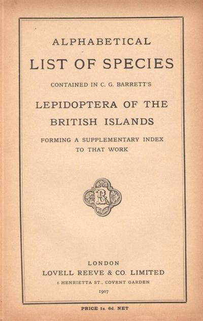 Alphabetaical List of Species contained in C.G.Barrett's Lepidoptera of the British Islands: forming a supplementary index to that work