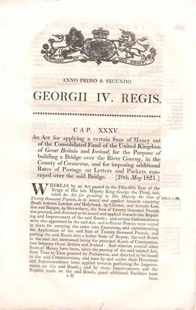 An Act for applying a certain Sum of Money out of the Consolidated Fund of the United Kingdom of Great Britain and Ireland, for the Purpose of building a Bridge over the River Conway, in the County of Carnarvon, and for imposing additional Rates of Postage on Letters and Packets conveyed over the said Bridge