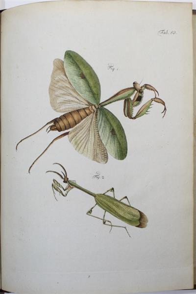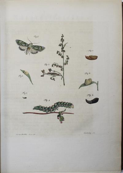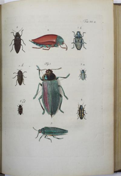 Very rare original German edition, published in eight parts. Beautifully hand-coloured plates engraved by J.R. Schellenberg, mostly illustrating Lepidoptera, Coleoptera and Orthoptera. Plates are numbered (some in manuscript): 1-18, 19a, 19b, 20-27, 28a, 28b, 28 Suppl., 29-36, 43-54; plates 37-42 were never published. This original edition is much scarcer than the French translation of 1794, which contained only 50 plates.