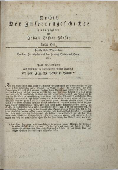 The work served as a reference for subsequent naturalists and entomologists, influencing the direction of entomological studies in Europe. Johann Kaspar Fuessly [Füssli] (1743-1786), was a Swiss entomologist and publisher, based in Zürich. Johann Rudolph Schellenberg (1740-1806) was a Swiss artist best known for his fine illustrations of insects. His artistic expertise elevated the scientific value of this work, bridging art and science in a manner characteristic of Enlightenment-era natural history.