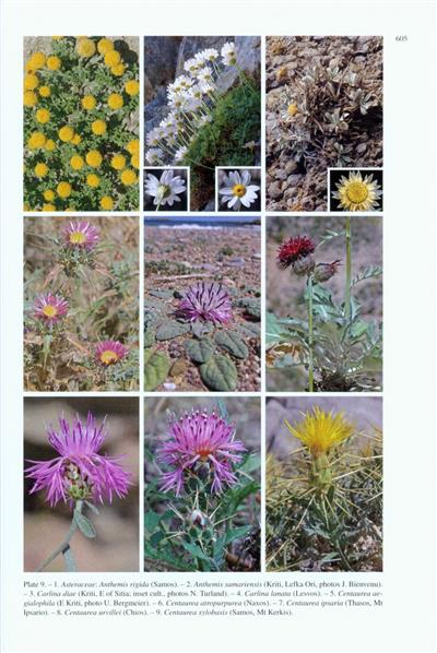 The text volume provides keys to species and, in some cases, subspecies. For each taxon there is a brief description (usually 60–120 words) with the emphasis on diagnostic characters, and there are frequently also notes on taxonomy, nomenclature, etymology, variation and other relevant features. Some 780 titles are listed in the references. The first two colour plates comprise 16 photographs of landscapes and vegetation; the remaining 46 show plant species, with nine photographs per page and insets with details; altogether 421 species are illustrated. Photographs have been selected to include common and characteristic species as well as many Aegean endemics or taxa that are otherwise of special taxonomic, biogeographical or ecological interest.