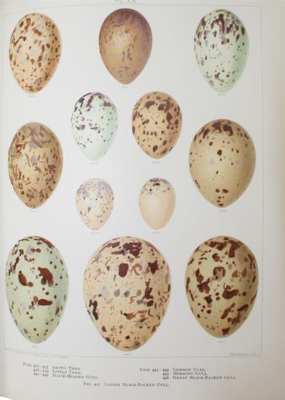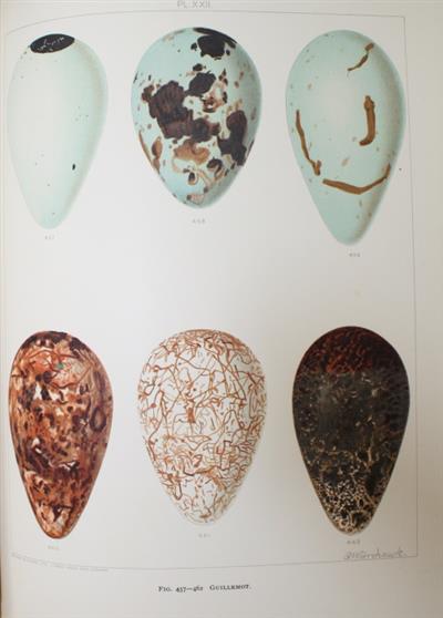Coloured plates by F.W. Frohawk (fine chromolithographs printed by Brumby & Clarke, illustrating 475 specimens, including the egg of the Great Auk). The plates were originally published in the 6-volume work, British Birds with their Nests and Eggs (1896-1898), and are here reissued with separate letterpress.