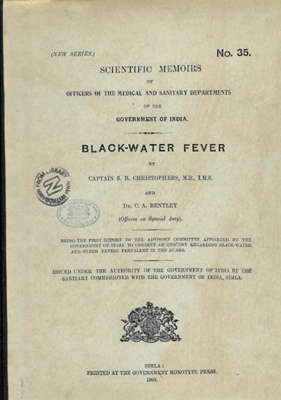 Scientific Memoirs by Officers of the Medical and Sanitary Departments of the Government of India. No 35. Samuel Rickard Christophers (1873-1978) was described as one of the great pioneers of Medical Entomology, 'to rank equally with his famous peers, Sir Patrick Manson, F.R.S., and Sir Ronald Ross' H. E.Shortt; P. C. C. Garnham (1979). An obituary for Prof C.A. Bently in Nature, 1949 noted the significance of this joint publication for 'establishing the dependence of this disease [black-water fever] on long-continued malarial infection'.
