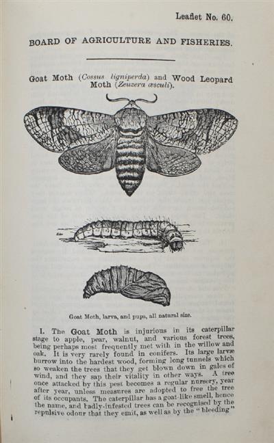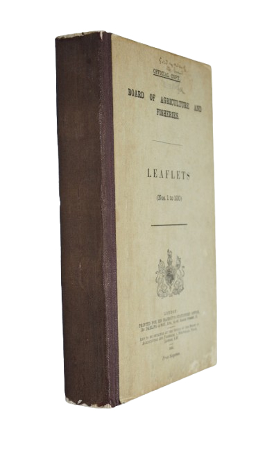Scarce first edition, 1,500 copies were published in July, 1904, due to their popularity a second edition was issued in November, 1904. The Board of Agriculture and Fisheries was established in the United Kingdom in 1903, when the earlier Board of Agriculture (created in 1889) was expanded to include oversight of fisheries. Its main role was to promote agricultural efficiency, improve rural livelihoods, and oversee matters related to farming, land use, and fisheries policy. As part of its educational and advisory work, the Board began publishing these short accessible leaflets, designed to inform the public about agricultural best practices, scientific developments, and government recommendations. Subjects include Acts of Parliament. Farm Animals, Wild Birds, Insects and Fungi injurious to crops.