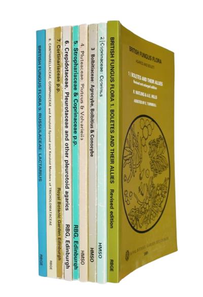 1: Boletes and their allies (revised edition, 2005, R. Watling & A.E. Hills); 2: Coprinaceae: Coprinus (1979, P.D. Orton & R. Watling); 3: Bolbitiaceae: Agrocybe, Bolbitius & Conocybe (1982, R. Watling); 4: Pluteaceae: Pluteus & Volvariella (1986, P.D. Orton); 5: Strophariaceae & Coprinaceae p.p. (1987, R. Watling & N.M. Gregory); 6: Crepidotaceae, Pleurotaceae and other pleurotoid agarics (1989, R. Watling & N.M. Gregory); 7: Cortinariaceae p.p. (1993, R. Watling & N.M. Gregory); 8: Cantharellaceae, Gomphaceae and Amyloid-Spored and Xeruloid Members of Tricholomataceae (excl. Mycena) (1998, R. Watling & E. Turnbull); 9: Russulaceae: Lactarius (2005, R.W. Rayner).