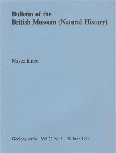 Bull. BM(NH) Geology 32(1): 1-90. Contents: C.G. Adams & P. Frame, Observations on Cycloclypeus (Cycloclypeus) Capenter and Cycloclypeus (Katacycloclypeus) Tan (Foraminiferida); P.J. Andrews & T.I. Molleson, The provenance of Sivapithecus africanus; L.R.M. Cocks, A silicified brachiopod fauna from the Silurian of Iran; J.J. Hooker, Two new condylarths (Mammalia) from the early Eocene of southern England; A.E. Longbottom, Miocene sharks' teeth from Ecuador; S.F. Morris, A new fossil terrestrial isopod with implications for the East African Miocene land form; C.B. Stringer, A re-evaluation of the fossil human calvaria from Singa, Sudan; P.E.S. Whalley, New species of Protorthoptera and Protodonata (Insecta) from the Upper Carboniferous of Britain, with a comment on the origin of wings.