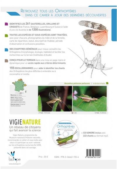 Text French. Field guide to the grasshoppers, crickets and bush crickets of France, Belgium, Luxembourg and Switzerland, with colour photos, illustrated keys, distribution maps and 155 oscillograms. Enables easy identification of species through illustrated keys and photographs. Includes a CD of 222 calls (mp3 format).