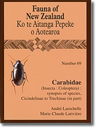 This volume partly updates Larochelle & Larivière’s Catalogue (FNZ 43) of 2001. Aimed at specialists and non-specialists, it should greatly facilitate identification and information gathering. Its purpose is to provide an overview of 134 species and subspecies belonging to the tribes Cicindelini, Pamborini, Amarotypini, Migadopini, Clivinini, Moriomorphini, and Trechini. Habitus colour photos and distribution maps are included for all taxa. Two genera and 16 species are described as new.