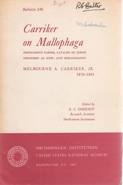 Carriker on Mallophaga: Posthumous Papers, Catalog of Forms described as new, and Bibliography. Melbourne A. Carriker, 1879-1965