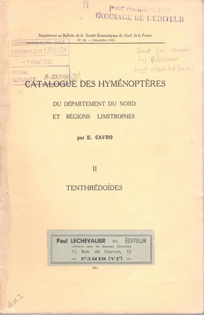 Catalogue des Hyménoptères du département du nord et régions limitrophes: II Tenthrédoïdes