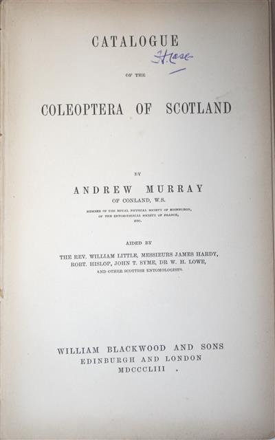 'By Andrew Murray of Conland, W.S. … Aided by the Rev. William Little, Messieurs James Hardy, Robt. Hislop, John T. Syme, Dr W.H. Lowe and other Scottish Entomologists.' 'The following catalogue has been undertaken, not solely with the view of recording some additions to the Insect Fauna of Scotland, but also with the intention of correcting the synonymy of some of the species which have been established on the authority of our great British Entomological authors ...' - Preface. A synonymic catalogue, with notes on locations, habitats, occurrence and collector. Very scarce. This copy with text printed one side of sheet only (probably intended for use as a label list). Other copies we have seen are not printed in this way.