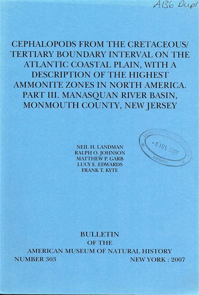 Cephalopods from Cretaceous/Tertiary Boundary Interval on the Atlantic Coastal Plain, with a description of the Highest Ammonite Zones in North America. Part III: Manasquan River Basin, Monmouth County, New Jersey
