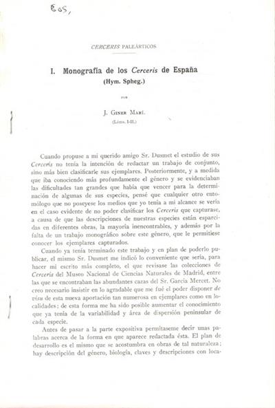 Cerceris Palearcticos I: Monografia de los Cerceris de España (Hym. Spheg.)