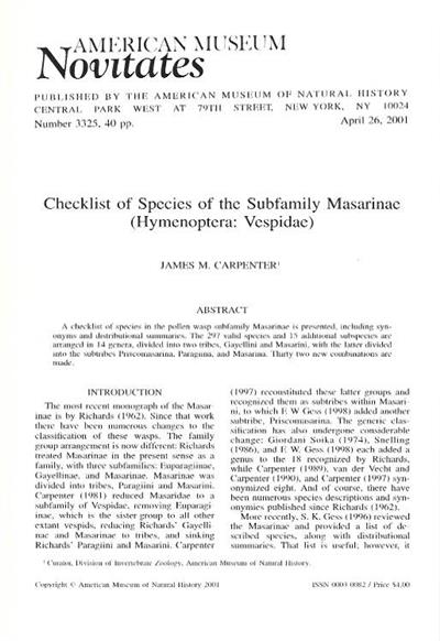 Checklist of Species of the Subfamily Masarinae (Hymenoptera: Vespidae)