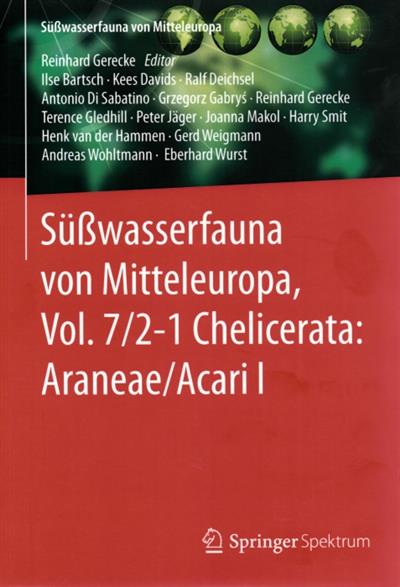 Text English. Uncorrected re-print. Current taxonomic knowledge on the aquatic spiders and mites of central Europe. This volume includes keys and ecological information on hygrophilous and aquatic spiders, a general introduction to mites, and the treatment of three groups generally known from terrestrial habitats (Acaridida, Oribatida, terrestrial Parasitengona). General introduction to the freshwater species of the originally marine Halacaridae, and the species-rich true freshwater mites (Hydrachnidia), with detailed taxonomic treatment and keys for superfamilies Stygothrombioidea, Hydrovolzioidea, Eylaoidea, and Hydrachnoidea. Three further volumes are in preparation which will include the remaining four superfamilies of Hydrachnidia and the larval stages of all superfamilies