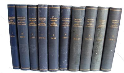 Fascinating series recording the geological and mineral explorations and exploitation of British colonies and dependent territories towards the end of the British colonial period and during the transition of former colonies to the Commonwealth. The editorial in Vol. 1 states that 'The purpose of Colonial Geology and Mineral Resources is to record the progress that is being made in the geological investigation of these territories with a view to their economic development.' A change of title with Vol. 7 was noted in an editorial, 'our former title, embodying the word ‘Colonial’ is no longer appropriate'. The journal was edited by E.H. Beard, Mineral Resources Division of the Colonial Geological Surveys.