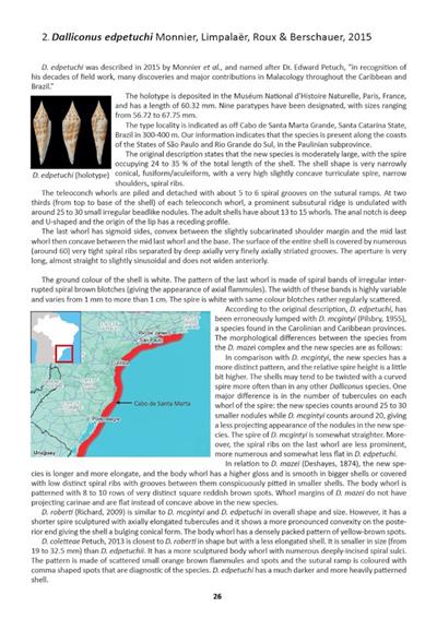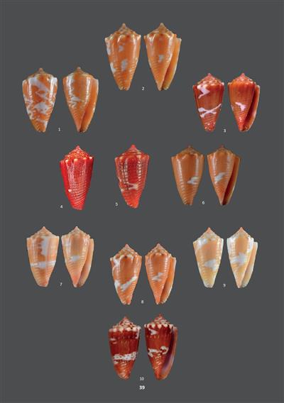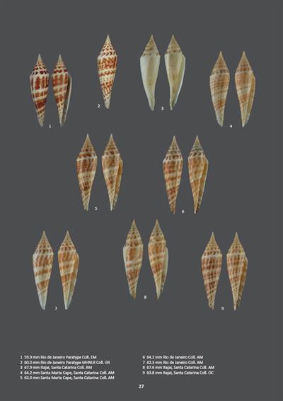 Some consider that there are too many look-alike small species, leading to a risky situation with possible synonymies. Therefore, we decided to present the exhaustive range of Brazilian species with more than 800 pictures, supplying information that could not be found in previous publications, discussing each presented species and guaranteeing a rather complete comprehension of the variation of each species. With 13 genera, the diversity of Brazilian cones is only starting to be understood, as the Brazilian Atlantic Ocean coastline is very extended along 7500 kilometres, with a lot of different ecological conditions from subtropical Rio Grande do Sul to equatorial Amp? and depth from intertidal to 300 metres.