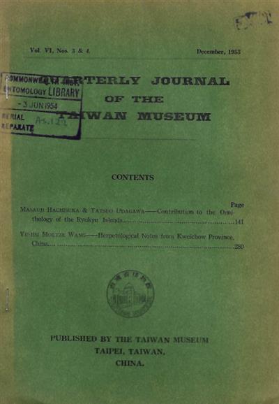 Text English. Quarterley Journal of the Taiwan Museum Vol. 4 (3-4). Considered an important paper for its coverage of the birds of Okinawa, the largest island in the Ryukyu Island chain.
