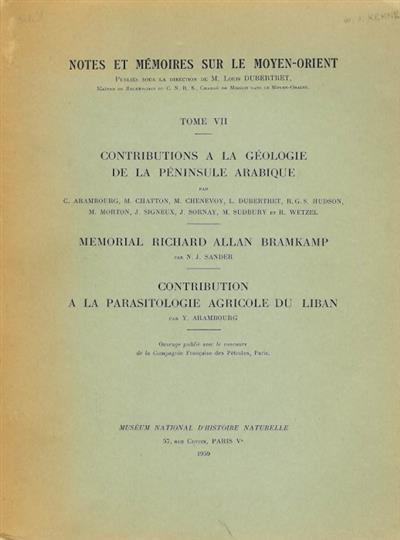 This volume also includes: 'Mémorial Richard Allan Bramkamp' by N.J. Sander (pp. 263-265, 1 pl.) and 'Contribution à la Parasitologie Agricole du Liban' by Y. Arambourg (pp. 267-279).