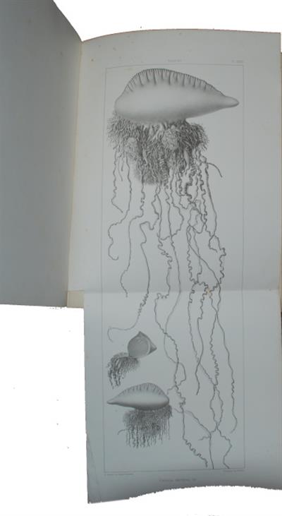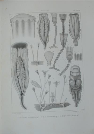 Vol. IV includes parts III-V of the second monograph: III. Discophorae; IV. Hydroidae; V. Homologies of the Radiata. The lithographic plates (numbered XX-XXIII, XXIIIa, XXIV-XXXV) are by H.J. Clark, who was employed by Agassiz to assist in the preparation of this series. Agassiz appeared as sole author of the work although Clark had performed much of the microscopical research and was responsible for large proportions of the text on jellyfish. This resulted in a dispute between the two men in which Clark circulated a statement of his case in an attempt to be recognised as an author.