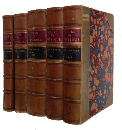 Fourth edition, expanded and entirely revised by Edmond Bouty. Text French. Vol. I: Instruments de mesure. Hydrostatique. Physique moléculaire; Vol. II: Thermometrie - Dilatations. Calorimétrie. Theorie mecanique de la chaleur. Propagation de la chaleur; Vol. III: Acoustique. - Optique geometrique. Etudes des radiations. - Optique physique; Vol. IV(1): Gravitation universelle. Electricité statique. - La pile. Phénomènes électrothermiques et électrochimiques; Vol. IV(2): Aimants. Magnétisme. Induction. Météorologie électrique. Applications. Théories générales.