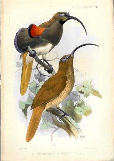 D'Albertis Bird of Paradise Drepanornis albertisi, showing the male and female - original colour print
