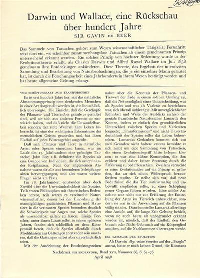 Darwin und Wallace, eine Ruckschau über hundert Jahre