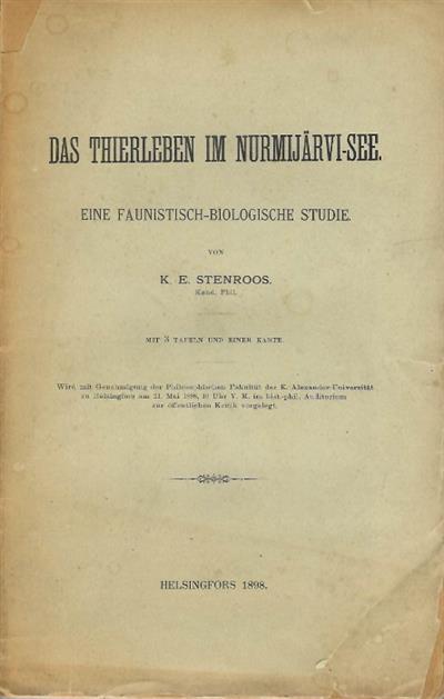 Text German. Nurmijärvi was a lake known for its bird life, in the Nurmijärvi municipality, Finland. This is a faunistic-biological study of the animal life found in the lake, particularly the Rotifera, Cladocera, Ostracoda and Copepoda. The lake was partially drained for farmland in the 1920s and fully dried up in the early 1950s.