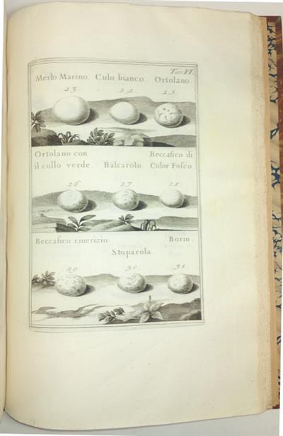 Very scarce. Text Italian. The first work dedicated to birds' eggs and nests (pp. 130, 22 plates). Also includes a separately paginated treatise on grasshoppers (pp. 55, 8 plates), 'Osservazioni giornali sopra le Cavallette.. Con una Dissertazione in fine intorno alle medesime' (pp. 1-33) and 'Dissertazione delle Cavallette' (pp. 35-55).