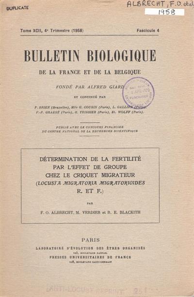 Determination de la fertilite par L'effet de groupe chez le criquet migrateur (Locusta migratoria migratorioides R. et F.)