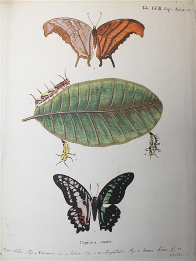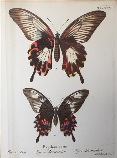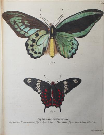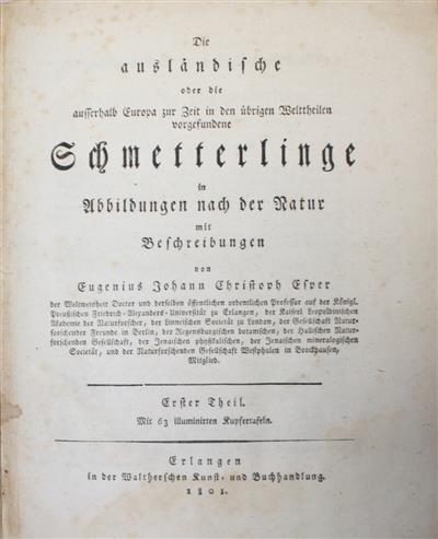 Part 1 (all published). First edition. Rare. The fine plates, after drawings by Esper, are delicately hand-coloured, and engraved by J.C. Bock, J.G. Sturm, H.J. Tyroff, and others. Each plate illustrates between two and four different butterflies, some also including their larvae, foodplants and pupae.